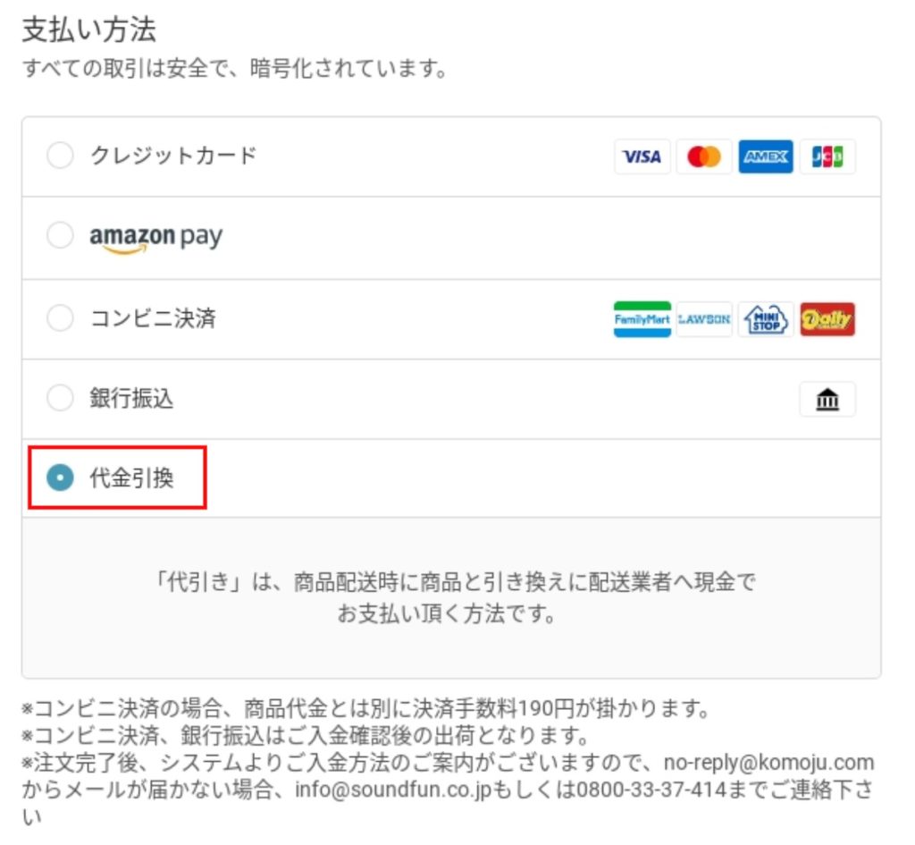 上でも説明しましたが、ミライスピーカーの購入で代金引換は使えます。